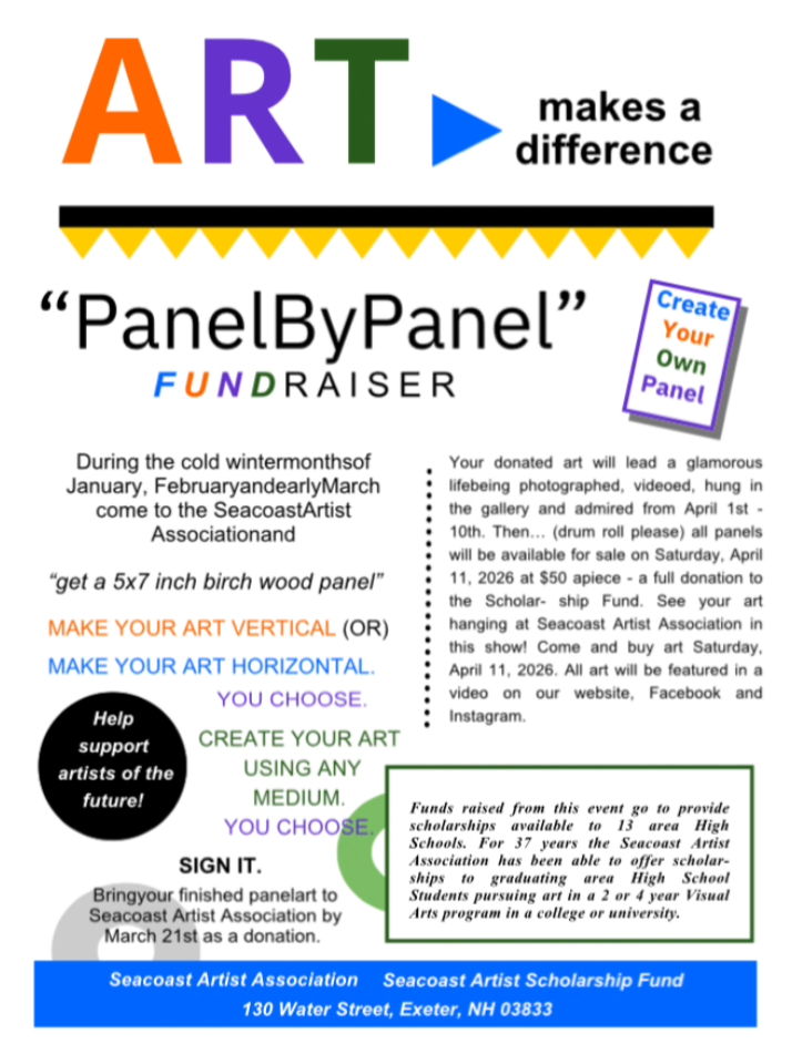 As the artist you may choose your medium. You may choose to make your art vertical or horizontal. Be sure and sign your artwork! Bring your finished panel art as a donation to Seacoast Artist Association on or before March 21, 2026.